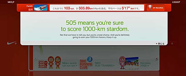 で、今日走り終えたら思いがけずNike+が女性の声で500kmがどーとか言ってました。