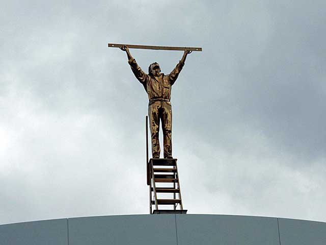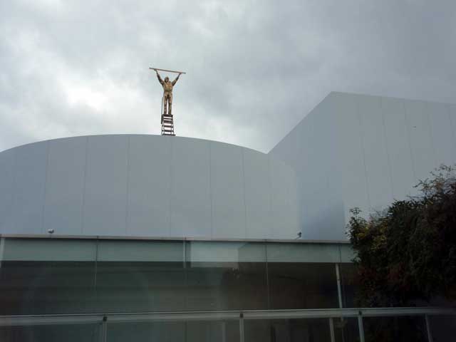 金ピカのオジさんが屋根の上に立ってます。