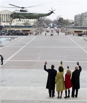 ヘリが飛び立った際、就任式の興奮さめやらぬ群衆から「ヘイ、ヘイ、ヘイ、グッドバイ」と唱和する声が、空へ向かって響き渡った。スポーツで勝利チームのファンが敗者に浴びせかけるからかいの歌で、歴史的な歓迎を受けたオバマ大統領とは対照的な、寂しい退任となった。