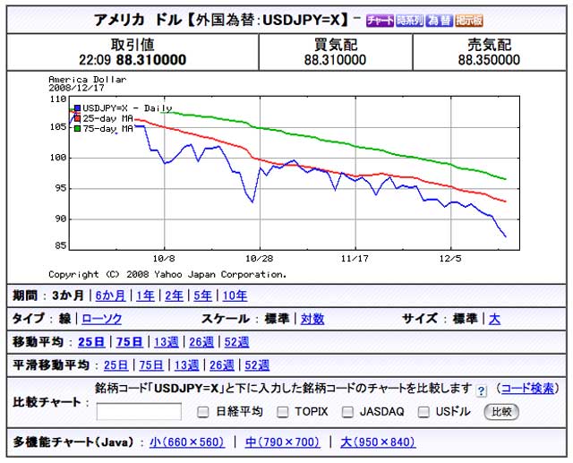 これはさっきヤホーファイナンスでとってきた円相場。