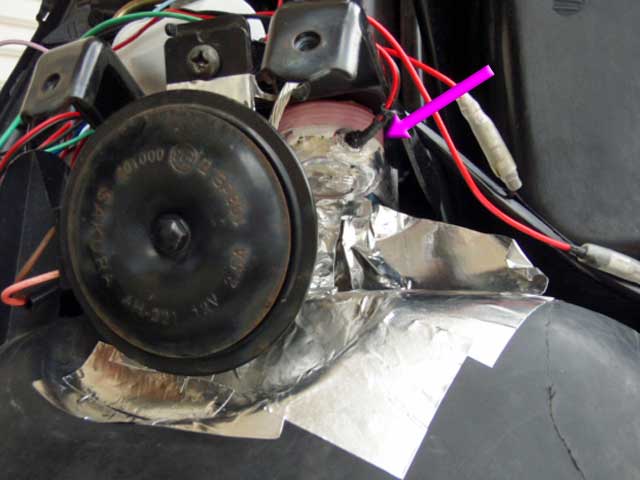 Fグリルの奥はホーンがあって、それのステーに下向きに光源を取付けました。(紫矢印)