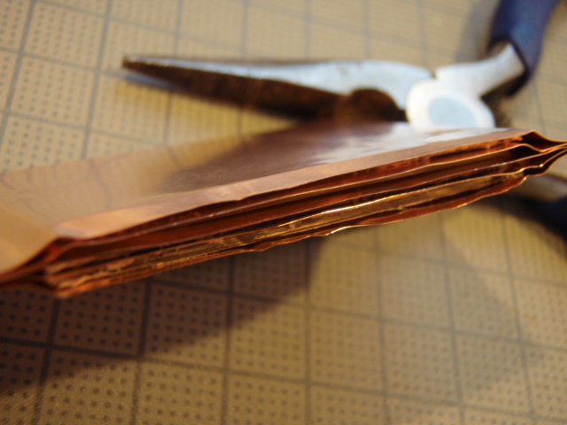 で、ま。製作の方ですが、作ってはみたけど効果はサッパリ...みたいのじゃ勿体ないので、今回はちゃんと作ろうと思って、銅板の間にトルマリン4枚を挟み込んでミルフィーユ状態にしました。原チャリだったらトルマリンの板をそのままエアクリーナに貼ってますね、多分。