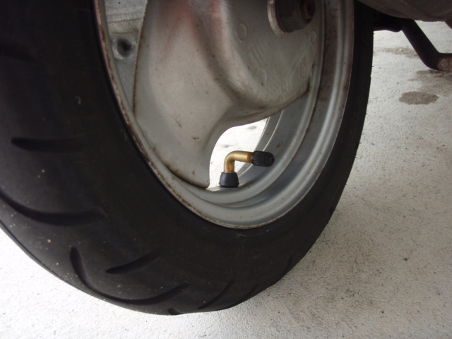 何年式のかも知らない古いスクーターですけど、走行距離は実走行で3500kmくらいだったんですね。おそらくタイヤ替えたこともないんでしょうけど、バルブの根元のゴムが経年劣化して裂けてたそうで、ついでだからと前後ホイルのバルブを替えてくれてました。(こうなるとタイヤ自体もちょと怖い。。