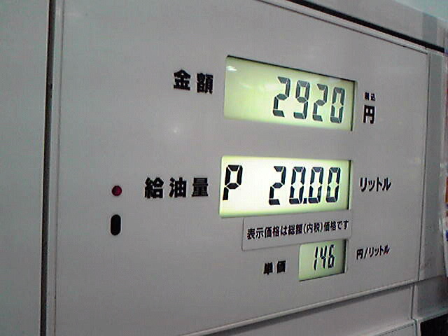とワーニングが鳴ったので帰りに入れて来たわけですが、でももうじき4月。暫定税率が期限切れで元どおりの税率になるし、世の中それ待ちで買い惜しみしてるらしい。それなら僕も。てゆわけで、噂の入れ控えすることにしたんですが、流石に10Lくらい入れてもまた3月中に入れなきゃならないだろうから、今日は20L入れました。軽四なら満タンですよね。