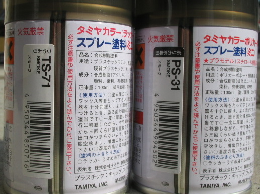 右が昨日買って来たタミヤのスプレー塗料で、左が以前使ったことがあるスプレー塗料。
