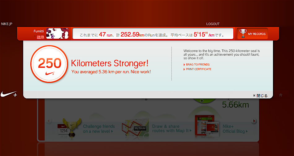 昨日の土曜の朝は雨だったのでキャンセルして、一日待って今朝、5.8kmジョグってきて、とうとう(てゆか、やっと?)NIKE + iPod で250kmを走りきりました