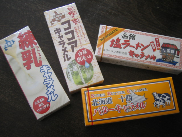 で、下は昨日行って来たんですが、地元の百貨店が客寄せでやってた北海道展で食べた旭川ラーメンで、その下がご当地キャラメルのなかから選んで買って来たキャラメルたち。
