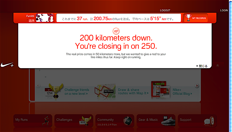 もう1ヶ月も前ですがNIKE+iPod で走ると、250kmでなにかあるみたいですね。