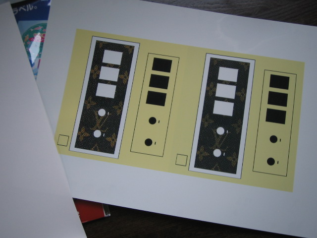イラストレィタで枠を作って、ガラを貼り込み、ステッカー作成用のプリンタ用紙にプリントアウトしたものを0.5mm厚のプラ板に貼付けて切り出します。