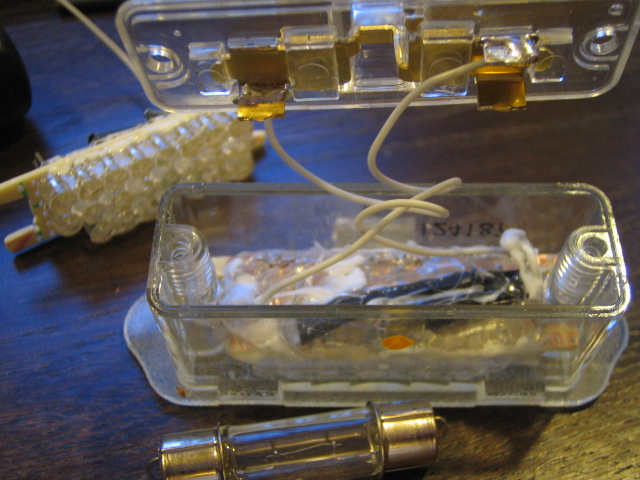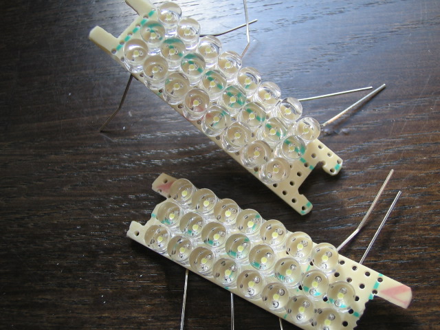 さてLEDに話を戻すと、φ5mmの白LEDの縁なしをビッチり敷き詰めて数で勝負。片側3x8個使いました。