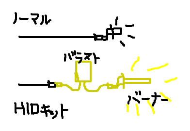 よく「リレーレス」とか書いてありますが、要はバッテリーから電力を引っ張って来て、純正のヘッドライトの配線からは電源を入り切りする信号だけもらいますよという従来の考え方は止めて、そんなめんどくさいことしないで、ヘッドライトの入力をそのままバラストの電源に使いますってことですよね。