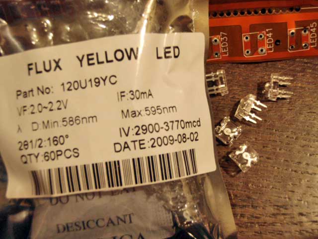 最初は3チップとか0.5Wとか、1列ウインカーですから高輝度のやつに差し替えようかと思ってましたが、基板も回路も元のヤツを使い回すんですから必要電流が増えるのは困る、てゆかコレ以上抵抗を差し替えたりするのもメンドクサイし、とゆことで、ここが肝心ですが、た ぶ ん 普通の30mAくらいが定格の赤色LEDだろうから同じIFが30mAのFLUX黄色にしときゃイイだろ的な。