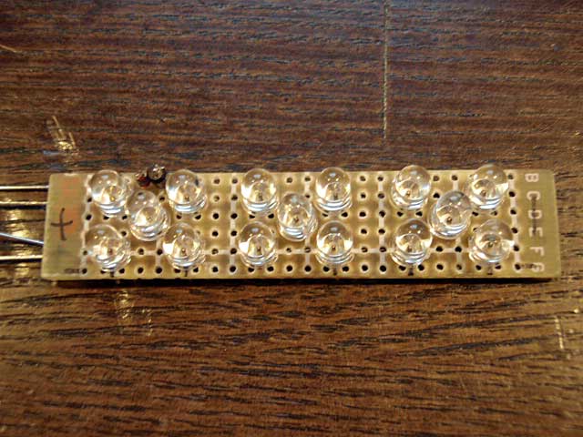 余ってた赤色LEDはちょうど15本あって、5本直列にしたものを3並列とします。